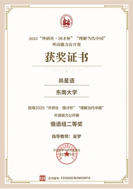近日,2025“外研社·国才杯”“理解当代中国”外语能力公开赛(多语种组)成绩正式揭晓。我们俄语专业2024级本科生尚星语凭借优异的语言素养与出色的综合能力,荣获俄语组全国二等奖。